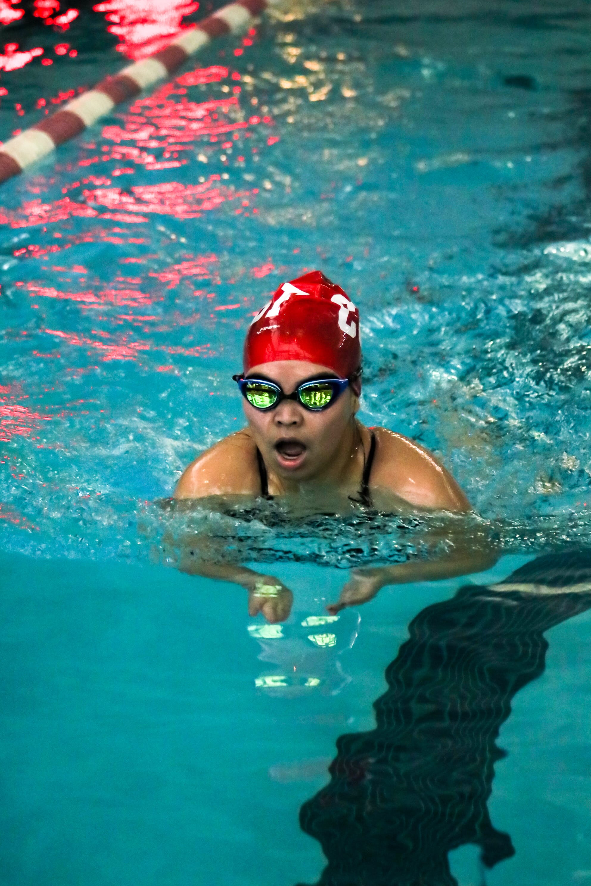 City College's Brianna Lee finishes strong in the Women's 100 Yard Breaststroke at CCSF's opening quad meet with a time of 1:56:84 after competing in two other events earlier in the day. Photo by Claudia Drdul/The GuardsmanCity College's team captain Margaux Ocampo competes during the backstroke heat, shaving off time for a new personal record of 1:17.95, at the first swim meet of the season on February 1, 2019. Photo by Cliff Fernandes/The GuardsmanKatherine Groffman starts out her first season on the Ram's swim team with a bang by finishing with a 2:32:68 in the Women's 200 Yard Freestyle during City College's opening quad meet. Photo by Claudia Drdul/The Guardsman