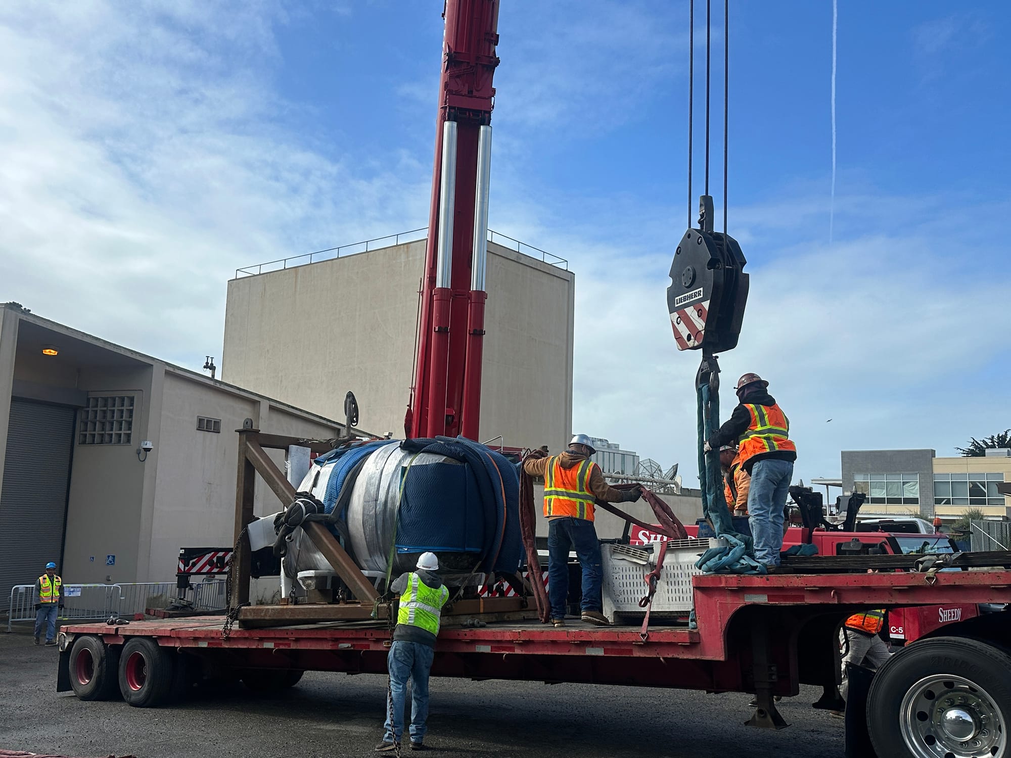 It was 6 a.m. on Valentine’s Day when Atthowe Fine Art Services – a company that works for the San Francisco Arts Commission – arrived on City College’s Ocean campus to begin wrapping the stone sculpture in protective pads. Riggers from Atthowe would proceed to spend hours preparing El Rey to be harnessed into a crane and lifted onto a flatbed truck.