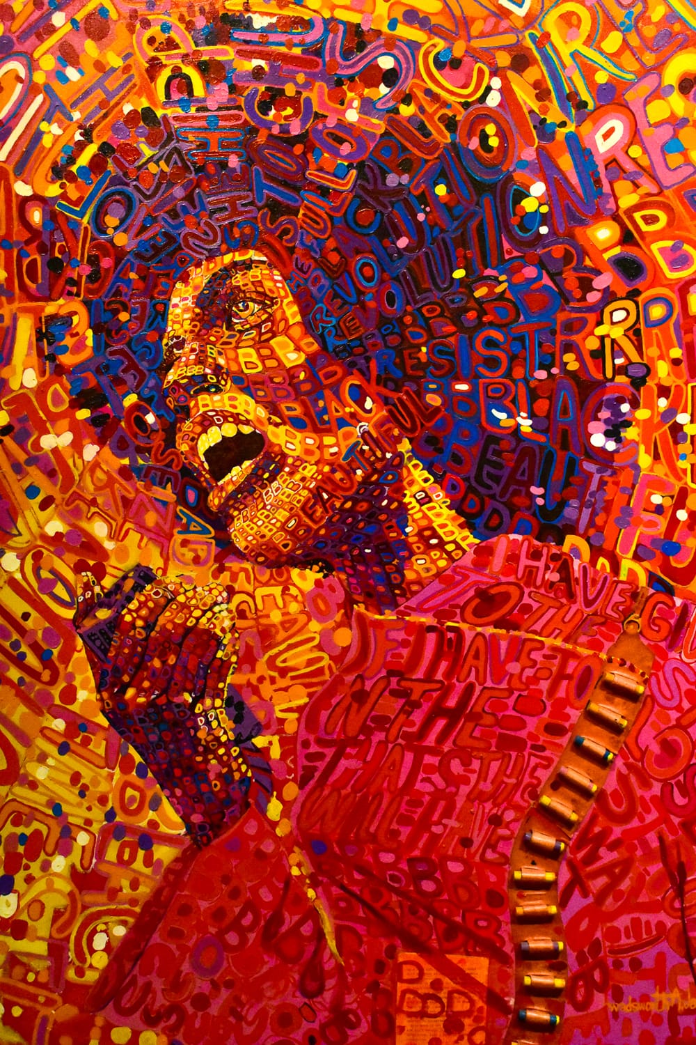 Artist Wadsworth Jarrell created Black Prince in 1971, which paid homage to actor Ossie Davis’s eulogy for Malcom X, a black nationalist leader. David said, “Our own black shining Prince!” Jarrell’s posthumous portrait of Malcom X repeats the letter B for “Black” “Beautiful” and “Bad.” The portrait also incorporates empowering words once said by Malcom X. “I believe in anything necessary to correct unjust conditions-political, economic, social, physical—anything necessary as long as it gets results,” Malcom X said.