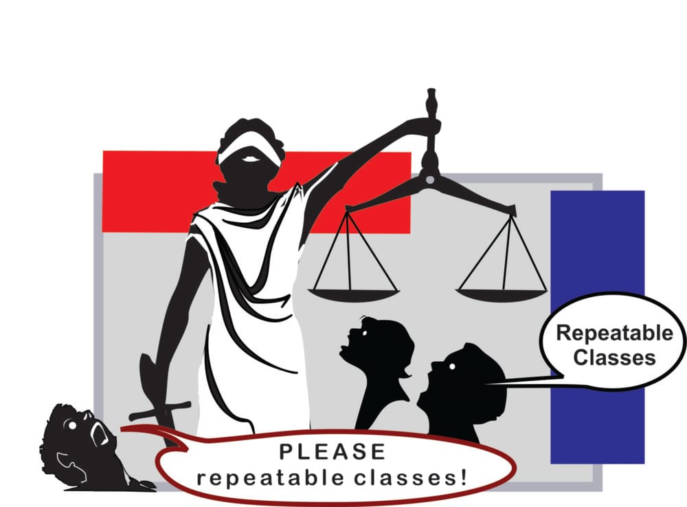 The answer is California Title 5 under Division 6; Chapter 6; Subchapter 1; Article 4 as it reads “District policy may not permit students to enroll more than one time in an active participatory course in physical education, visual arts, or performing arts pursuant to this section.” and similarly “may not permit student enrollment in…more than four times for semester courses or six times for quarter courses.”
