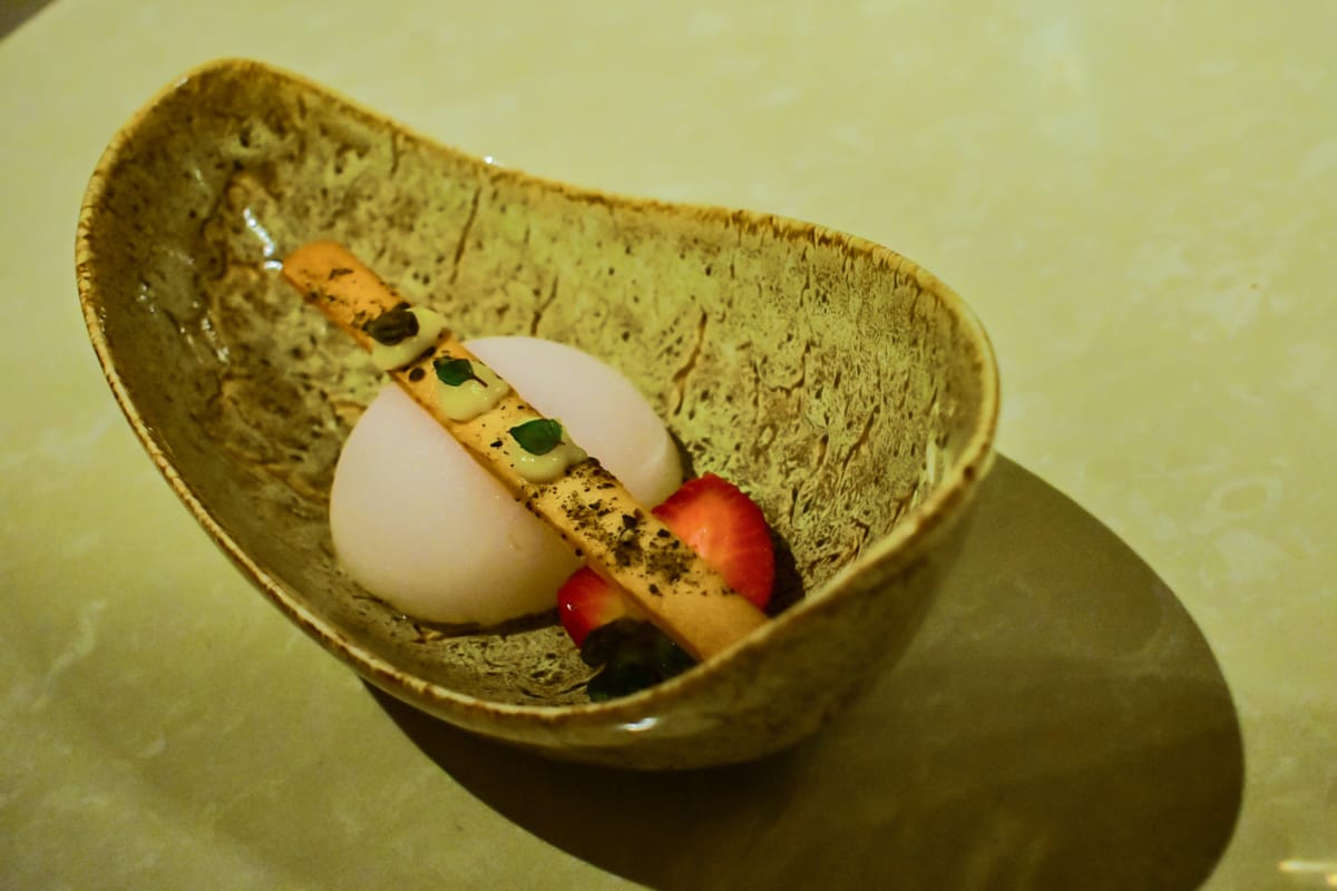 For dessert, the team served a refreshing rose champagne sorbet, with a long thin tuile on top. Of course the chefs couldn’t end the meal on such a simple note without adding a couple of interesting twists. On one end of the tuile were three tiny dots of lemon curd, each topped with a petite basil leaf. The other end was sprinkled with black pepper, adding a surprising but welcome kick to the dessert.