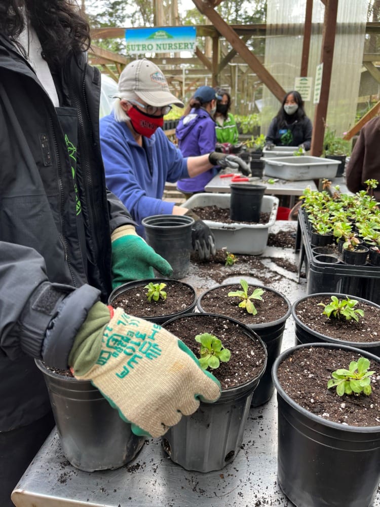 For Conservation, volunteers sign up for shifts that are available 2 days a week. Each volunteer work session in the nursery starts with a homage to the Ramaytush Ohlone People in which Mount Sutro sits on their traditional lands. Volunteers then divide themselves into groups in which station they’d like to work on. Some activities the nursery volunteers are involved in are washing pots, pruning plants, planting seeds, and plant propagation.