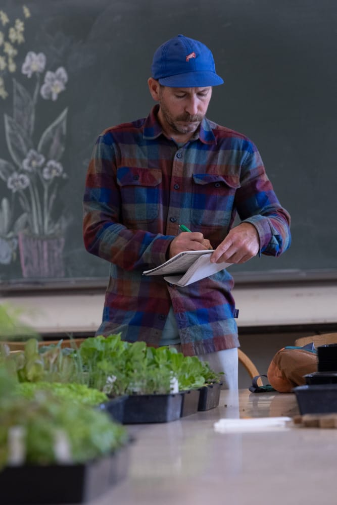 This Saturday morning he is preparing his introductory Horticulture 50 class to repot and eventually transfer seedlings into the garden. Sitting on the edge of his desk, enthusiastically poking holes in the air, he describes nature’s circular process of enriching soil, and human efforts to quicken the process with hot composting.