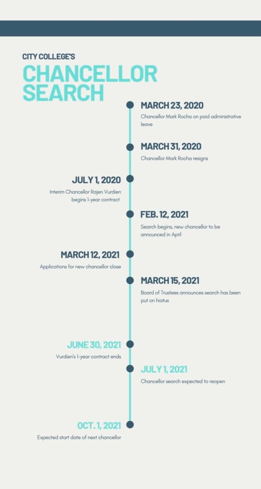 The search committee is a body made up of students, faculty, administrators, and community members involved with the recruiting and screening of candidates for the chancellor position. Tim Wolfred, who served as a trustee at City College from 1981 to 1995 and is a member of the search committee, said a three month leadership gap can be easily remedied by the board.