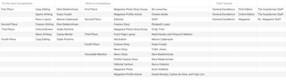 Co-chief editor of The Guardsman Eleni Balakrishnan was awarded first place in copy editing in addition to placing second for feature writing at the convention’s on-the-spot contests.