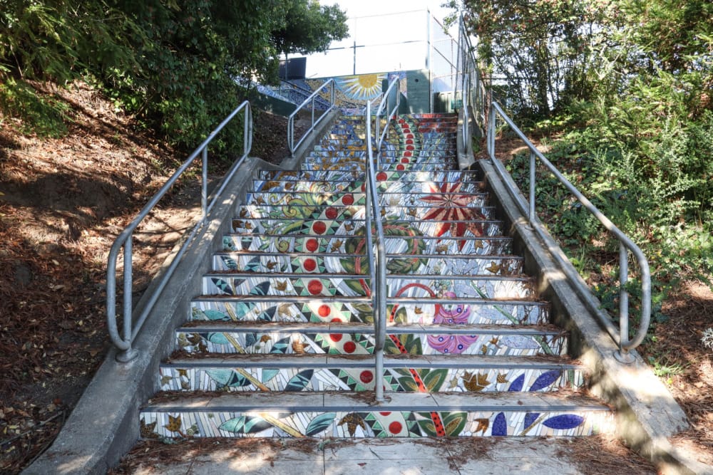 To make the walk in the park a little longer there are some noteworthy staircases in the neighborhood such as the Dragon Tale and Bengal Alley staircases. The Dragon Tale staircase is a mosaic staircase located off Bella Vista Way and goes up to the back entrance of Miraloma Elementary School. The same designers who designed the Instagrammy 16th Avenue Tiled staircase also did this one, so it has a similar artistic look. The tiles on the stairs depict different leaves and shrubs with the Dragon’s Tale and the side of the staircase on the wall has a colorful mosaic of the dragon breathing fire. The Bengal Staircase called Bengal Alley on the east side of the park on Miraloma Drive are a zig zag pattern going around planter beds then ascending an old cobblestoned stretch of stairs. Altogether it’s around 113 stairs which brings you from Miraloma to Lansdale Ave.