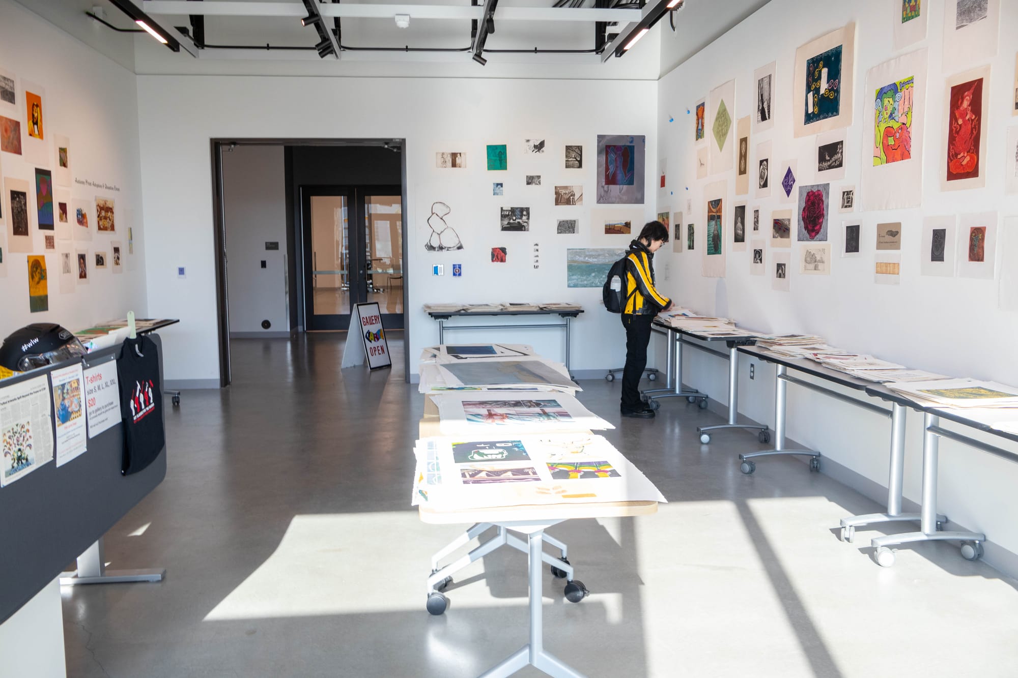 Walking into the room, you’re confronted by hundreds of prints hung all over the walls with different shapes, colors and techniques. Your eyes don’t know which one to look at first. Stacks of prints were arranged across the tables, where people spent up to an hour searching for their favorite.