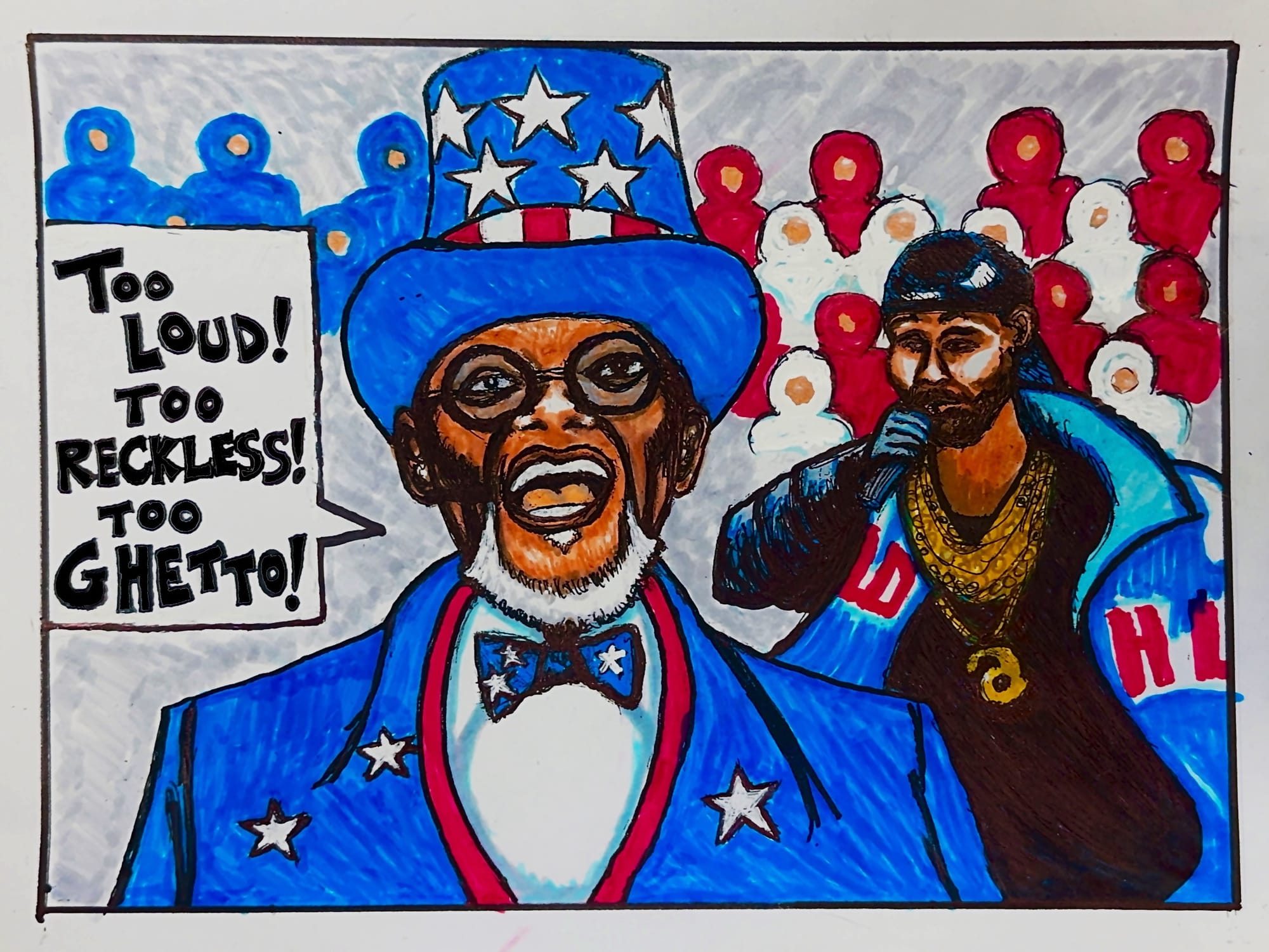 Throughout the show, the camera pans between Kendrick performing songs such as “Squabble Up” and “Man in the Garden” off his newest album, “GNX,” and Uncle Sam satirically commenting on the performance. Uncle Sam interjects, “No, no, no, no! Too loud, too reckless—too ghetto!” “Squabble Up” references Lamar’s unapologetic music style when it comes to critiques by the industry and by white people who will never understand what it means to live as a black person in America.
