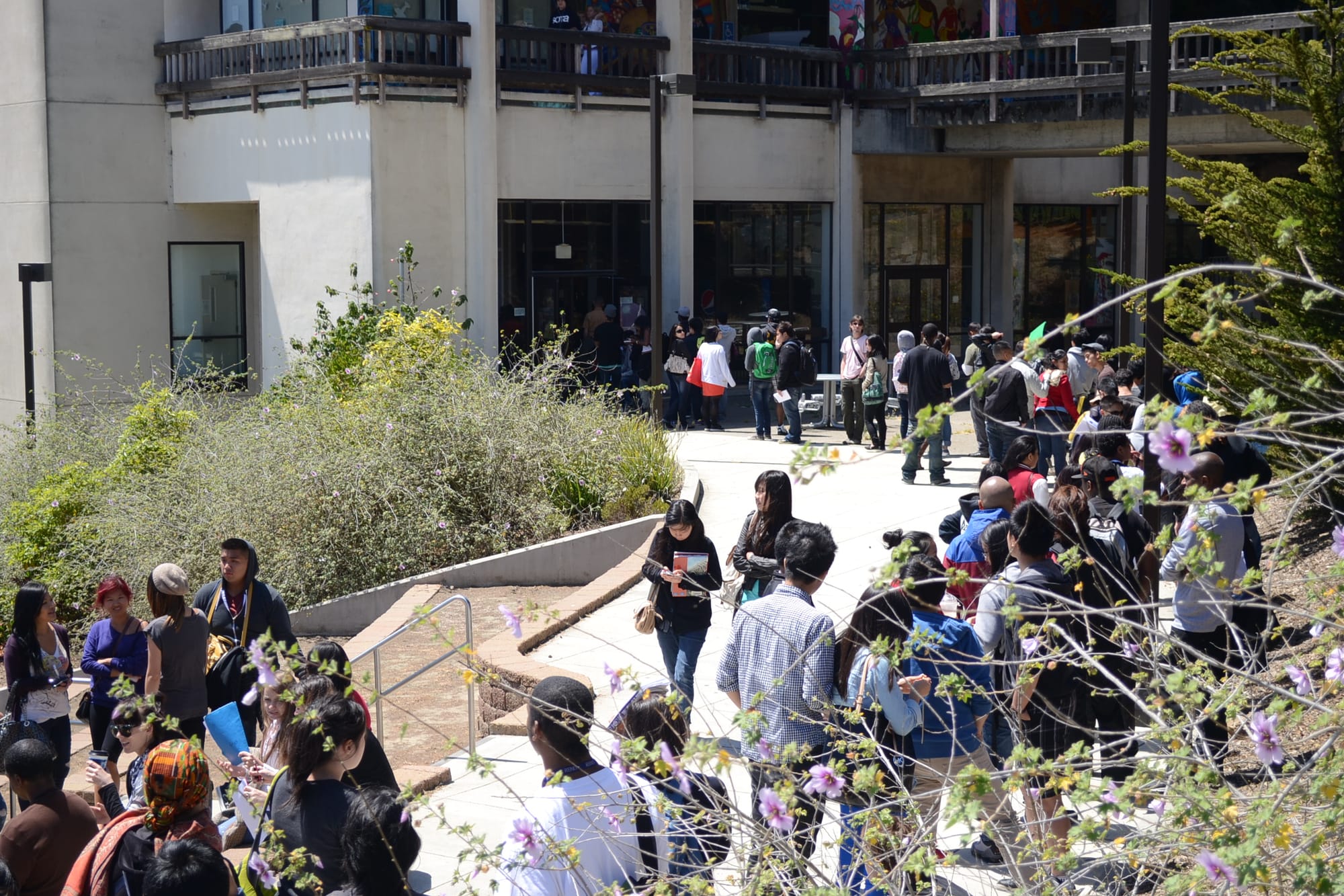 A line spilled out of the student union cafe on Ocean campus today as more than 200 students waited patiently for their chance to check out two text books for free.