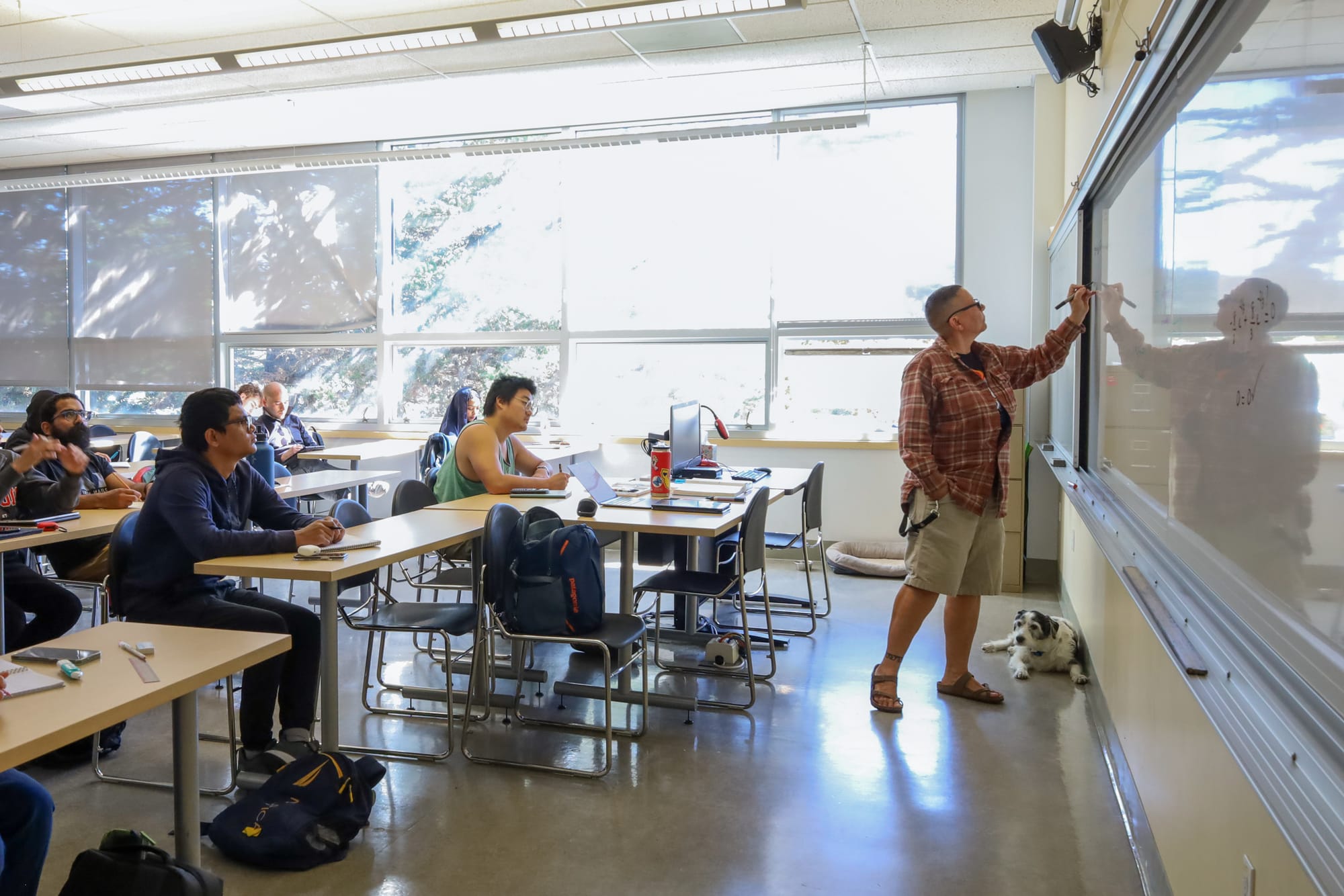 In a busy classroom at City College’s Ocean campus, Mary Bravewoman stands at the front with a whiteboard full of equations behind her. She speaks energetically, explaining details of Pre-Calculus and Trigonometry, using big gestures to show important concepts. At her feet, Dolly, her faithful canine companion, rests, occasionally raising her head to look around the room.
