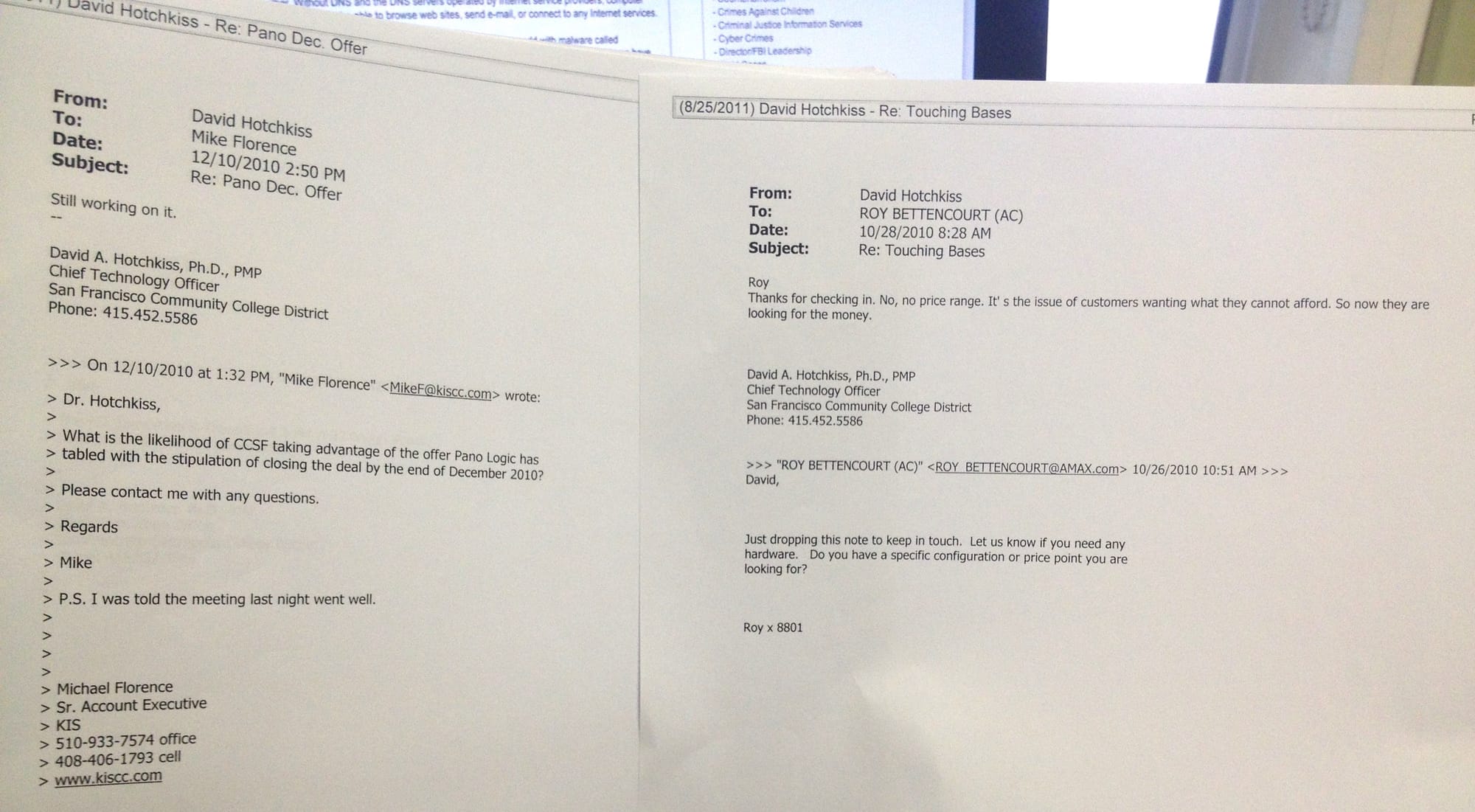 Hotchkiss said that Trustee John Rizzo called him up two days before the meeting to tell Hotchkiss that he put his report on the agenda. The CTO’s presentation turned up in an SF Chronicle news article that gave the college a media relations black eye.