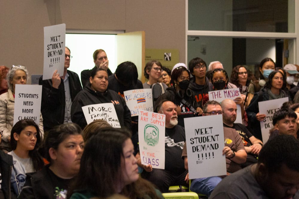 The crowded room overflowed with impassioned community members and signs that read “Students Need More Classes!” and “Meet Student Demand!”