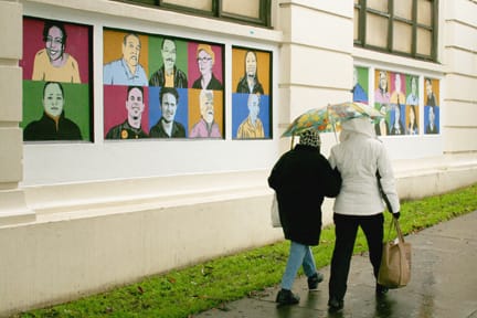 City College Journalism Department Chair Juan Gonzales is depicted in a mural on the exterior wall of Horace Mann Middle School. Gonzales can be found second from the left, top row. The yet-to-be completed mural, done in partnership with the San Francisco Museum of Modern Art, honors community heroe