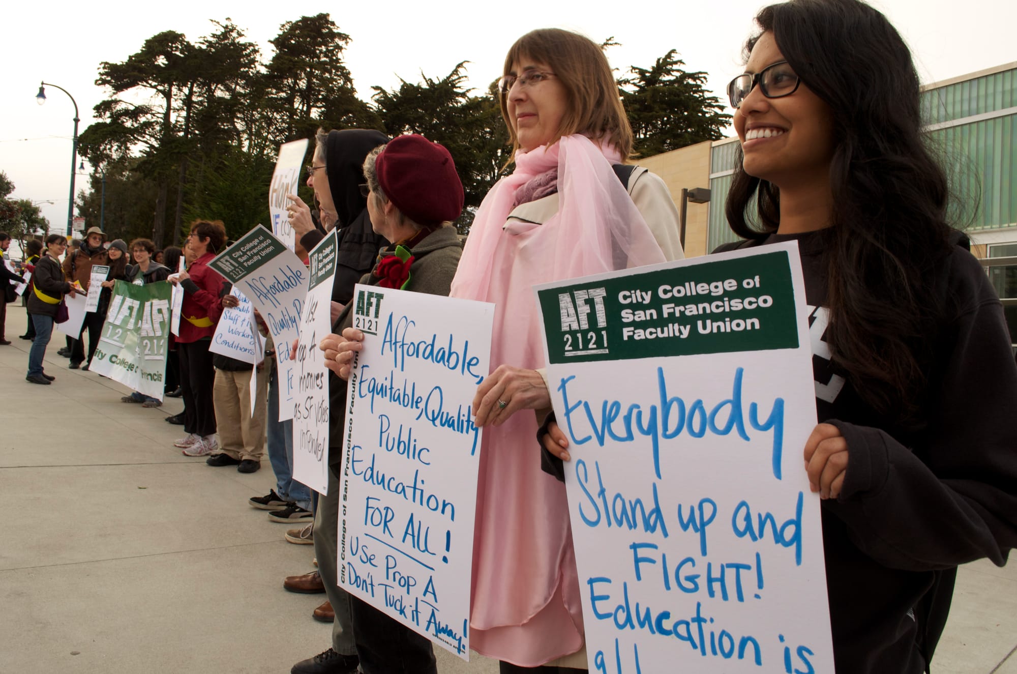 Students and teachers wore heart badges and stood in bike lanes to wave large signs at passing cars, prompting them to “Honk for CCSF!” A loud brass band and a chorus line of improvised singers accompanied the demonstrators.