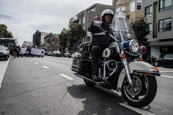 The cross streets of Mission Street were subsequently filled with varied chants of “We want the money,” and its Spanish equivalent, “Queremos el dinero,” leaving several bystanders amused and traffic somewhat halted. It was at this point that the SFPD began to escort the protest, by way of patrol motorbikes and a police van.