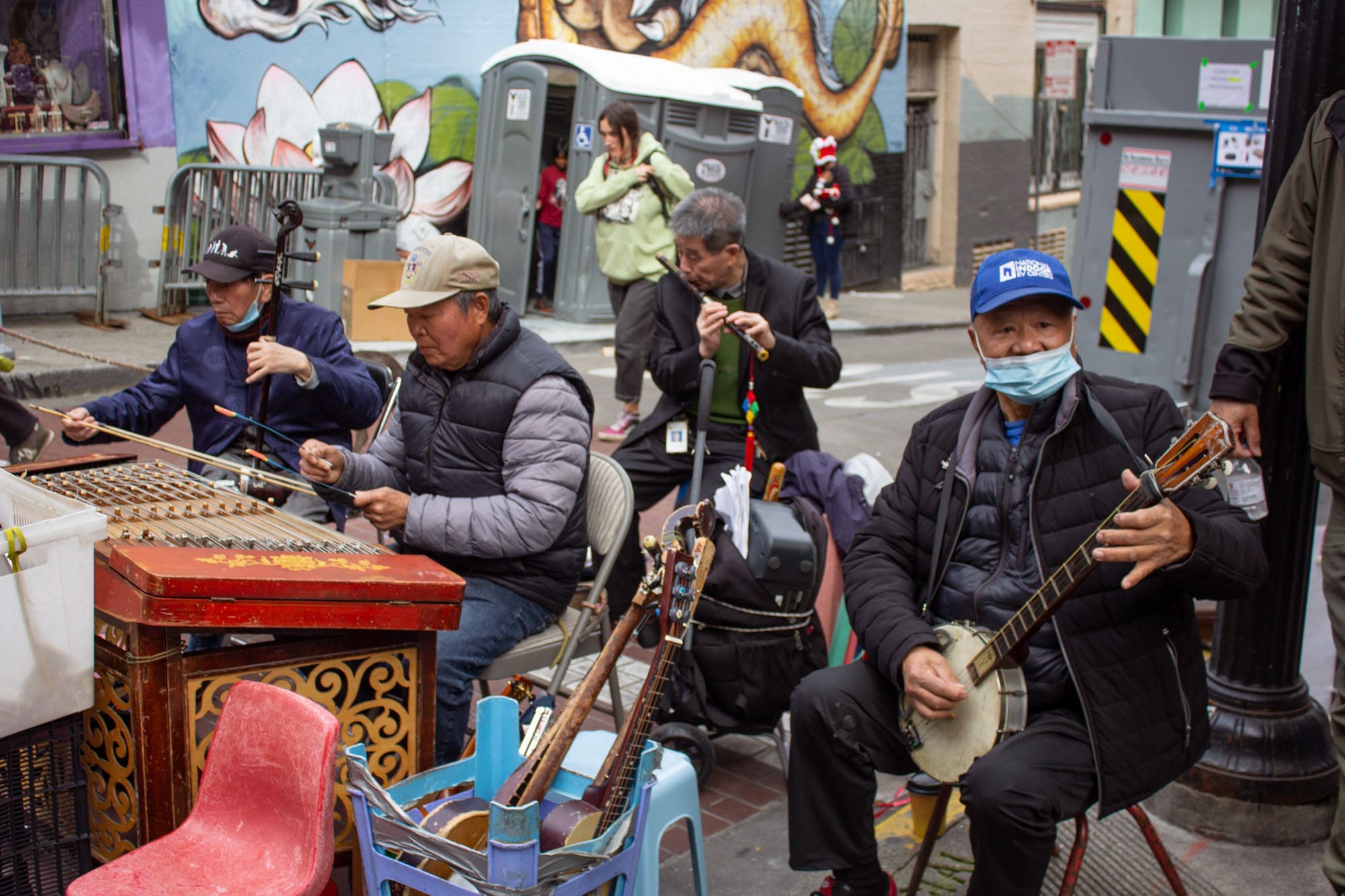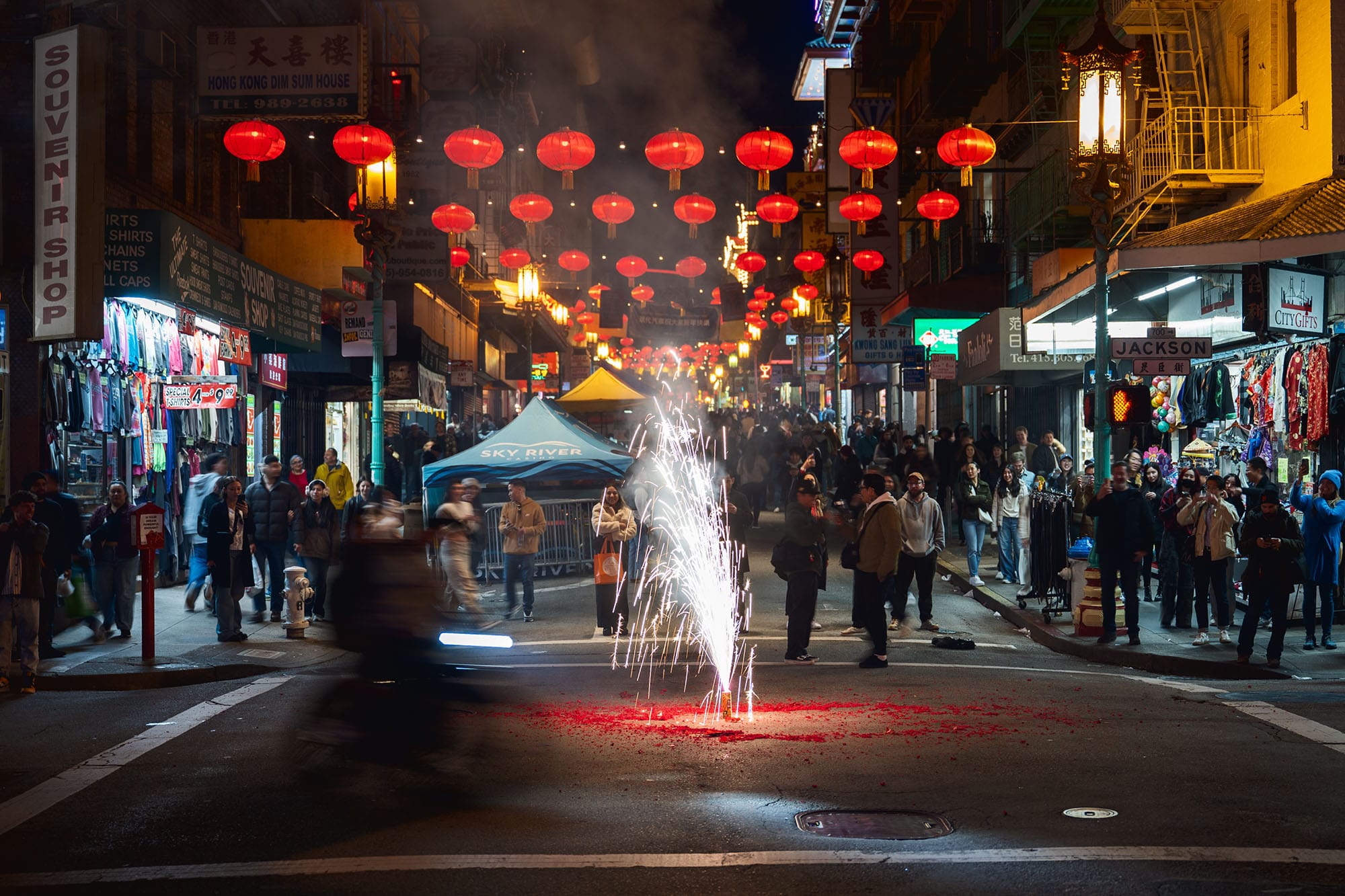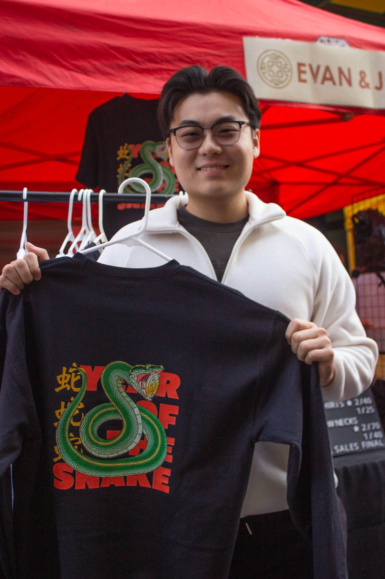 Crowds stretched as far as the eye could see down Grant Avenue for the Community Street Fair. Gold banners hanging throughout the neighborhood celebrated Mayor Daniel Lurie, who would serve as honorary grand marshal of the parade alongside Chinese American actress Joan Chen. Feb. 15, 2025 (Kyra Young/The Guardsman)A group of friends look back at the Zodiac Wall, an iconic mural set up in Jack Kerouac Alley for the Lunar New Year. The mural consists of over 1,100 red envelopes – traditional for the new year – and has been annually set up for over a decade by the hands of Nancy Yu Law and her family. Jack Kerouac Alley connects the Chinatown and North Beach neighborhoods. Feb. 15, 2025 (Kyra Young/The Guardsman)The vibrant, acrobatic dragons symbolize great power, auspiciousness and dignity. During the parade's Dragon Dance, dancers will rhythmically move the long puppets to ward off evil spirits. Feb. 15, 2025 (Kyra Young/The Guardsman)Nathan Hua, a second year City College design student, holds his 2025 Year of the Snake design on a crewneck for Evan & Josh. The family-founded photography and videography business aims to promote and celebrate Chinese Asian culture. Feb. 15, 2025 (Kyra Young/The Guardsman)Music filled the air as performers serenaded the Community Street Fair. Feb. 15, 2025 (Kyra Young/The Guardsman)A duo on a bike orbit a sparkler fountain at the intersection of Grant Avenue and Jackson Street. Feb. 15, 2025 (Patrick Perkins/The Guardsman)The vibrant head of a dragon puppet waits to be paraded by members of Yau Kung Moon Martial Arts School in San Francisco. Feb. 15, 2025 (Kyra Young/The Guardsman)A couple watching fireworks above the intersection of Grant Avenue and Washington Street, a block from the Lunar New Year parade route. Feb. 15, 2025 (Patrick Perkins/The Guardsman)