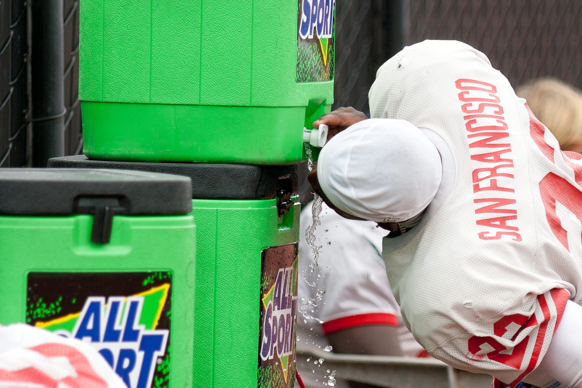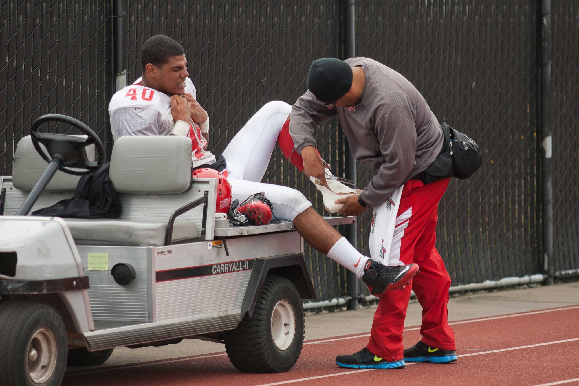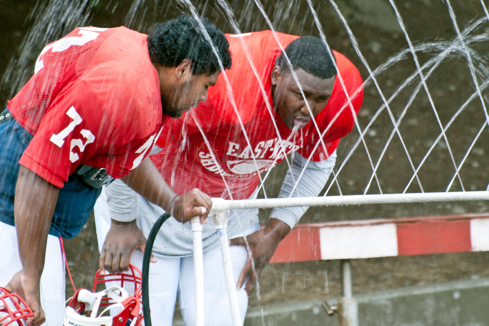 City College's football team has been preparing for the start of their season with rigorous yet necessary practices under the direction of Head Coach George Rush. The Rams held an early morning practice scrimage on Aug. 18, 2012 at Ocean campus. Their claimed their 9th National Champions title last year. "(This year) we have an outstanding freshman class, and there are quite a few returning players," Rush said. "The guys have a lot of confidence, and we have great team speed." The Rams will begin their season on September 1 with a home game against Diablo Valley College at 1 p.m. Photo by James Fanucchi/The GuardsmanDeandre Thompson, a freshman receiver for the RAMS, leaps to successfully complete a pass at practice on Aug. 15, 2012. Photo by James Fanucchi/The GuardsmanSophmore quarterback Andrew Spivey scans for an open receiver during a midfield play at City College's RAM Stadium during a Saturday morning scrimmage on Aug. 18, 2012. Photo by James Fanucchi/The GuardsmanFreshman Jeremiah Stuckey, defensive tackle, leaves the Wellness Center locker rooms Saturday afternoon to join his teammates back on the Ocean campus football field following a scrimmage played earlier that morning on Aug. 18, 2012. The practice was a double session with the scrimmage at 9 a.m., a comprehensive taped video review of the scrimmage at 12:30 p.m. and concluded with a routine practice which ended at 3:30 p.m. Photo by James Fanucchi/The GuardsmanAthletic Trainer Jose Bonilla, right, examines the ankle of defensive end Chris Martin, left, as a precautionary measure when Martin's ankle began hurting during a Saturday morning practice scrimmage on Aug. 18, 2012. "If you're hurt, you can still go, but if you're injured, you're out", Martin explained. "It's like one of those situations where it just hurts so bad you have to make it funny", he added. Photo by James Fanucchi/The GuardsmanMembers of the Rams grab their gear in the locker room and head out tot he football field for practice on Aug. 15, 2012. Photo by James Fanucchi/The GuardsmanThe Rams scrimage against each other at City College's Ocean campus football field on Aug. 18, 2012 prior to the start of the new season. Photo by James Fanucchi/The GuardsmanRams members stay hydrated and keep cool during practice. Photo by James Fanucchi/The GuardsmanRams members stay hydrated and keep cool during practice. Photo by Clarivel Fong/The Guardsman