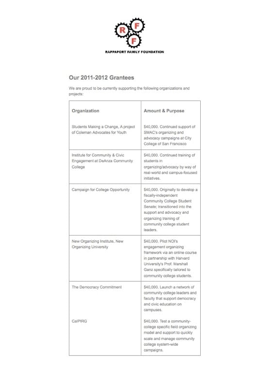 One of the many private funders behind the controversial Student Success Task Force, the Rappaport Family Foundation seeks to encourage student activism and civic engagement at community colleges in California, according to their website.