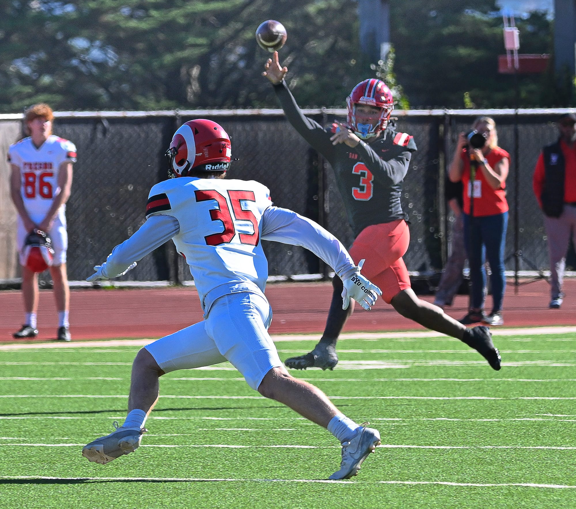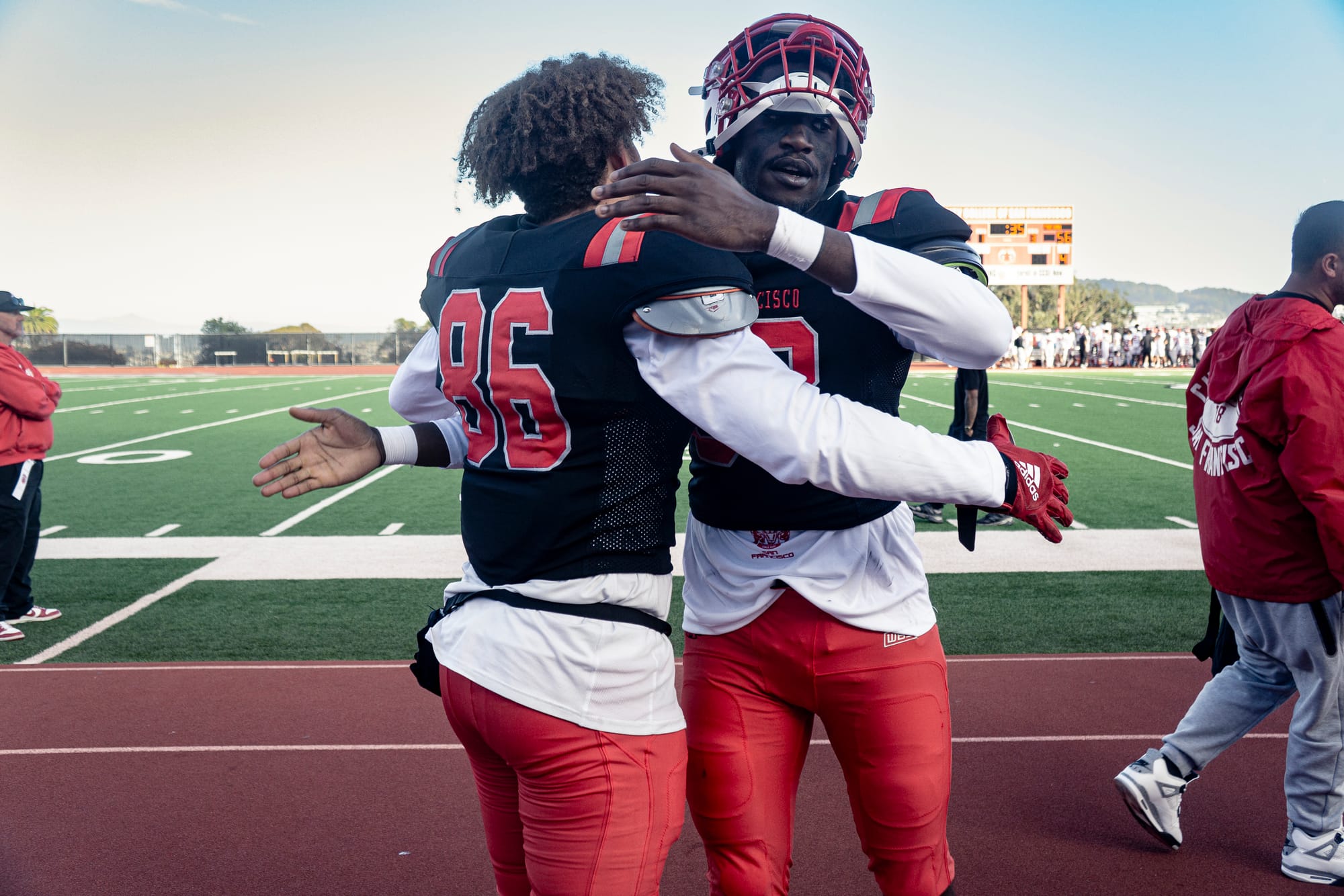 Rams QB Darius Clark-James (3) scrambles to throw to an open receiver during the playoffs against Fresno City College in San Francisco, on Saturday, Nov. 11, 2025. Clark-James threw for 357 yards and 2 TDs, he also ran for 142 yds and 3 TDs. (Bob Kinoshita/The Guardsman)Rams WR Isaiah Kesihk (15) catches a pass from QB Darius Clark-James for a TD during the playoffs against Fresno City College in San Francisco, on Saturday, Nov. 11, 2025. Kesihk caught a game-high 10 passes for 228 yards. (Bob Kinoshita/The Guardsman)Tight End James Walsh (88) hugs teammate Tyler Cross (86) moments after playing in his final game with the Rams. Nov. 22, 2025.(Karim Farahat/The Guardsman)