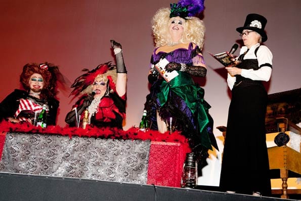 The festivities of Sept 22 kicked off with a pre-party in the mezzanine. The theme was the Barbary Coast, San Francisco’s old red-light district. Girls in tight corsets and fancy bustle skirts milled about while party-goers danced to a live band, enjoyed free food and drink, got their pictures taken at the “mustache booth”, or spun a wheel of fortune that blessed them with condoms, lube, porn DVDs or high-end vibrators.