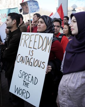 A few thousand people gathered in Civic Center Feb. 5 to stand in support of the Egyptian people and demand an end to the regime of Hosni Mubarak, who has held power for nearly 30 years.