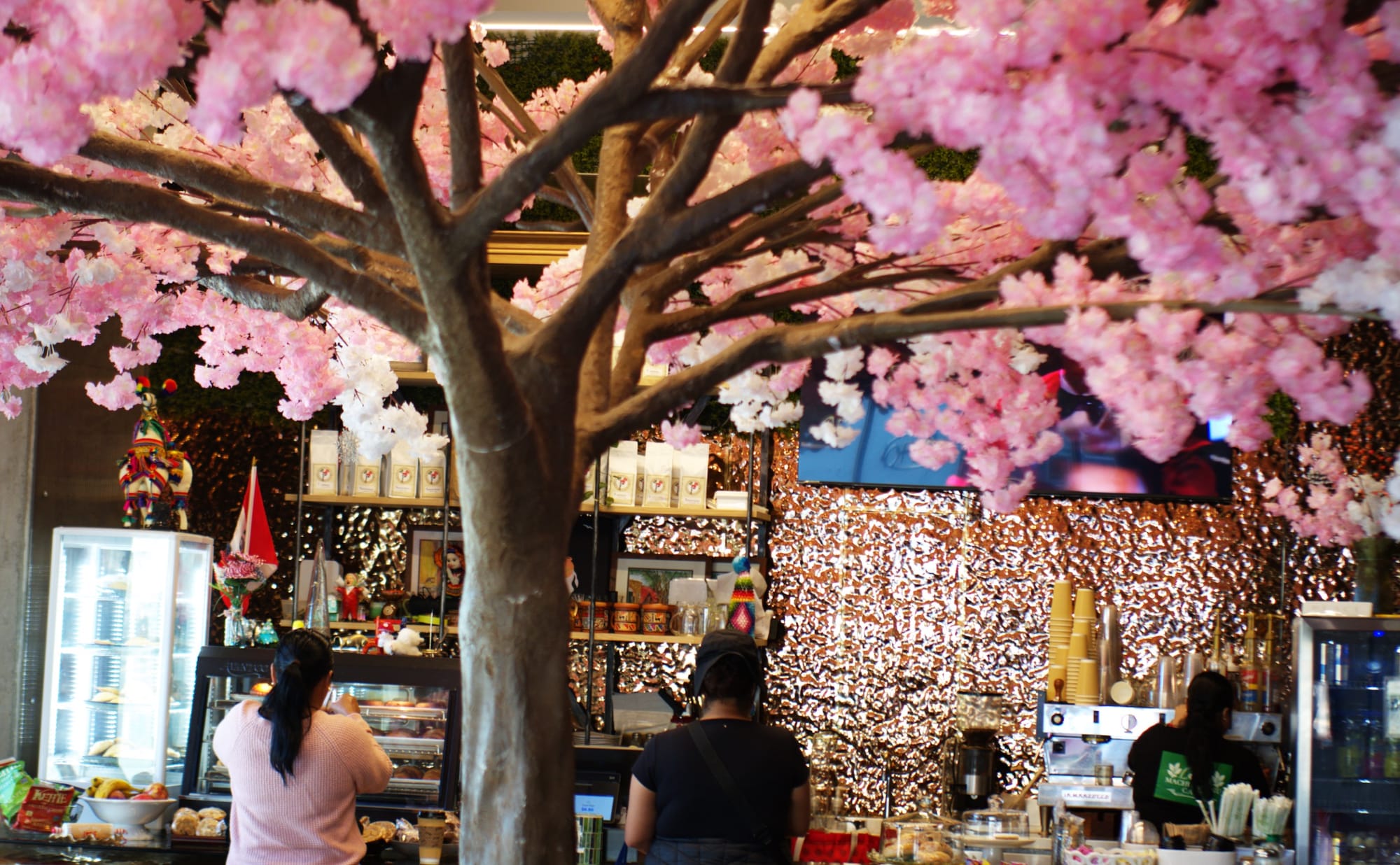 The interior is something you must see in person to truly appreciate. A faux cherry tree fills the center of the room, dimpled copper sheets cover the counter and back wall, and a TV plays mall pop until an ad occasionally takes over. The tables are a bit wobbly, but the Wi-Fi password is available upon request, and a few outlets are scattered along the walls. Best for squeezing in an hour of work between classes when you don’t mind a little visual chaos.