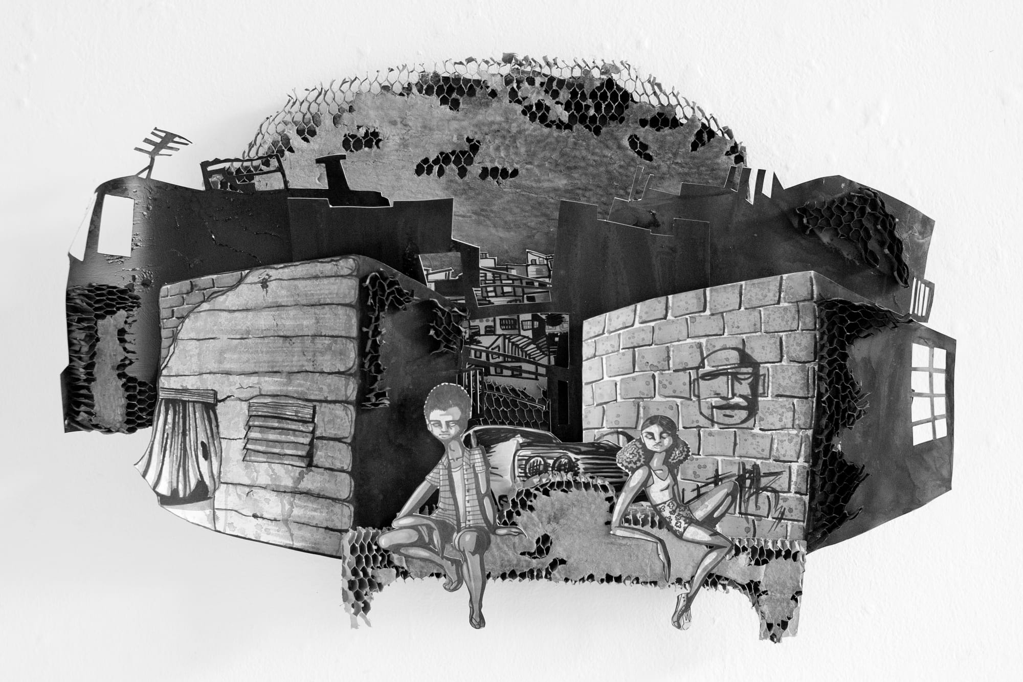 Joriz Madrid’s Favela is a painted cardboard pop-out wasteland featuring a honeycombed pattern of burnt sky and rust. It overlooks a section of Rio de Janeiro with two young figures looming in the foreground. The artist cited the Brazilian film “City of God” as an influence for the visual aesthetic of the piece.